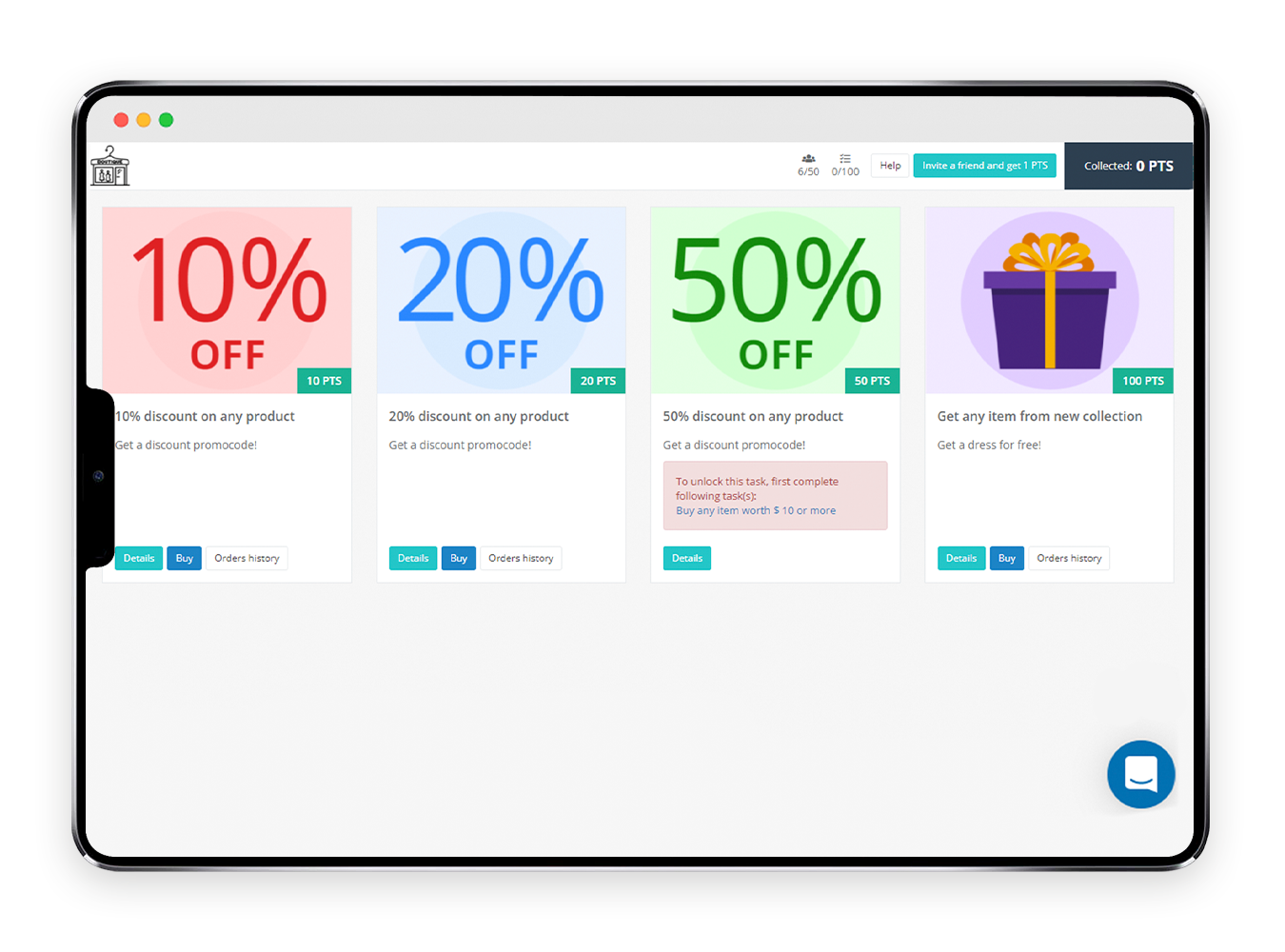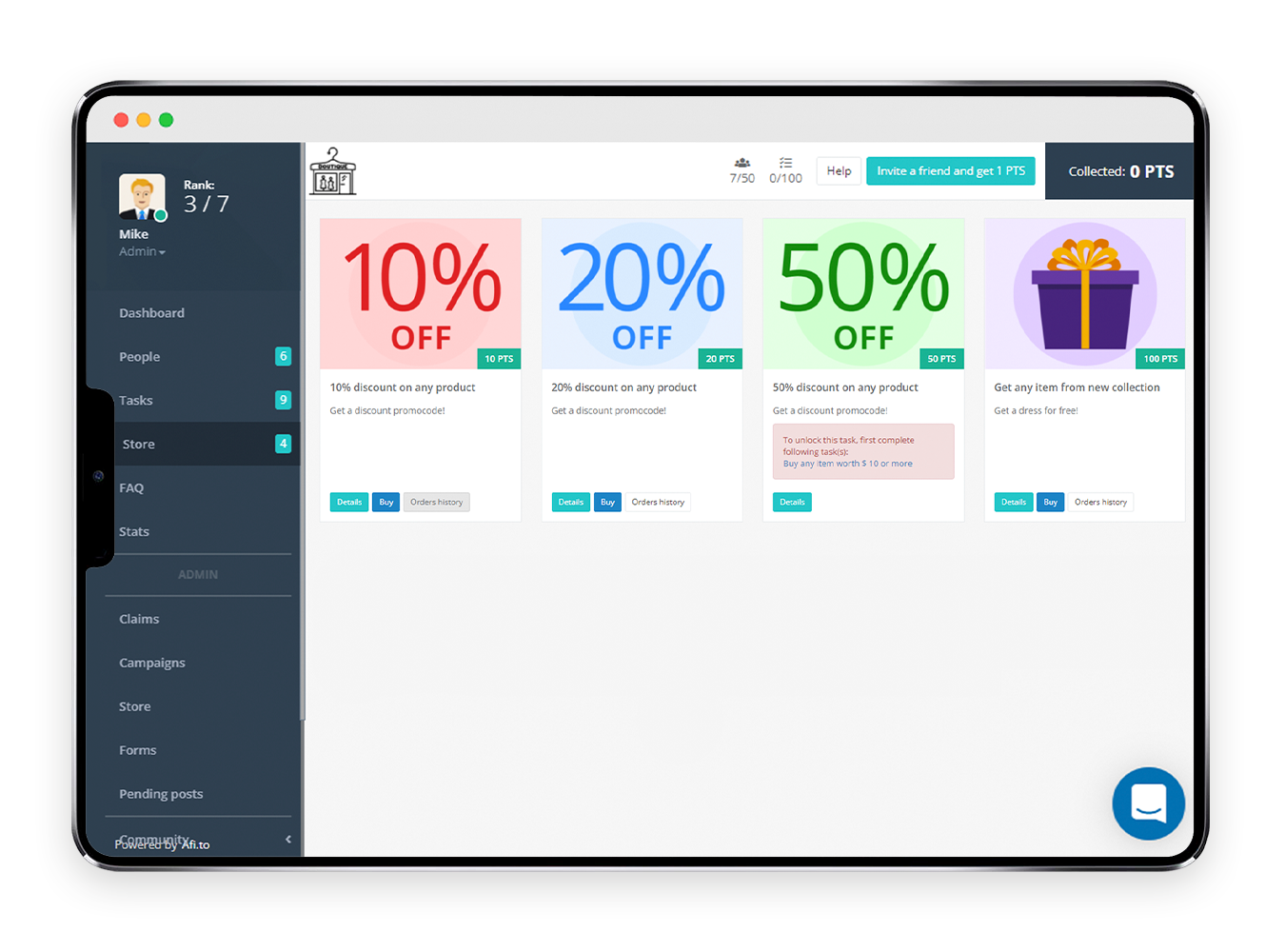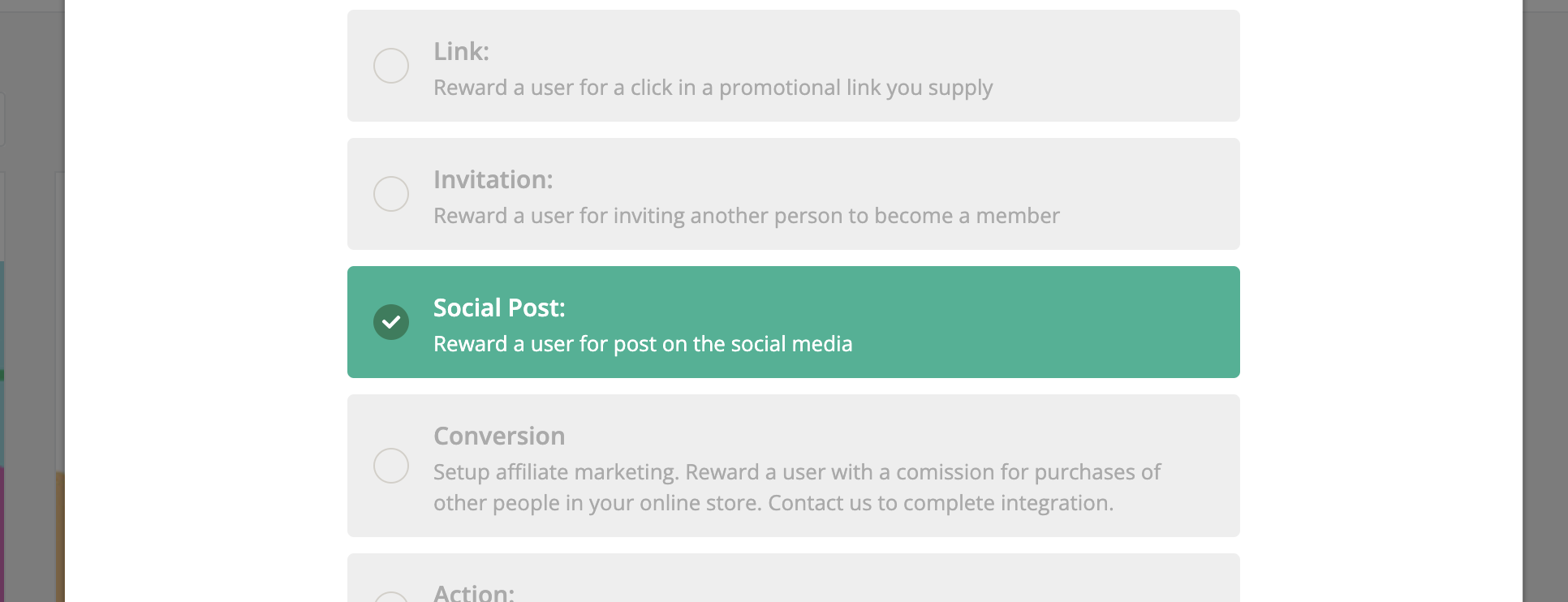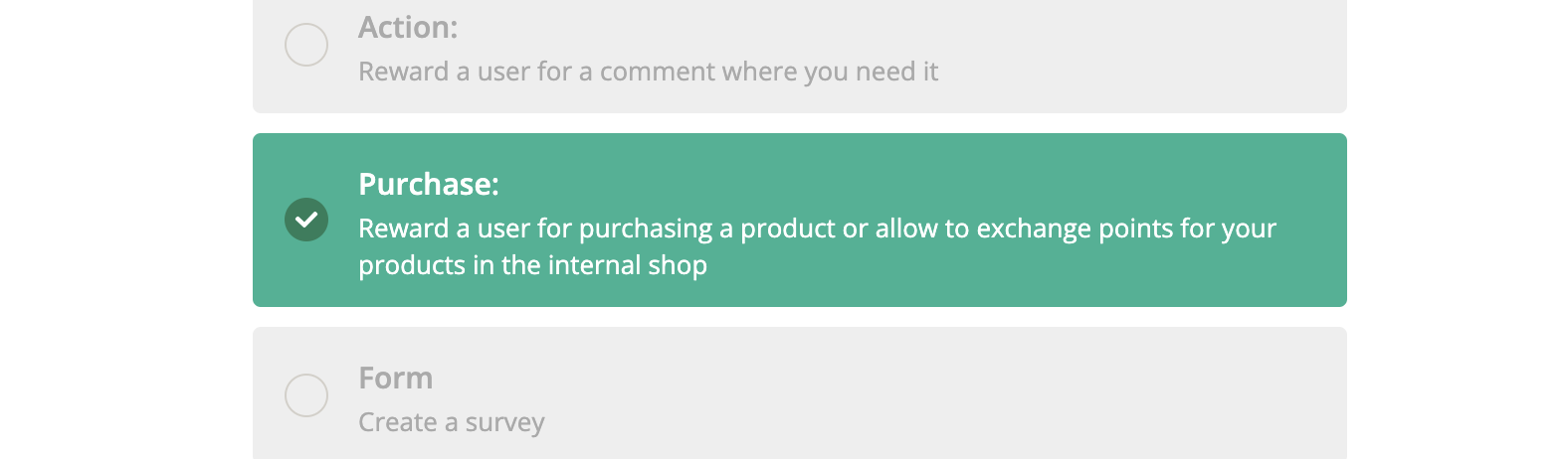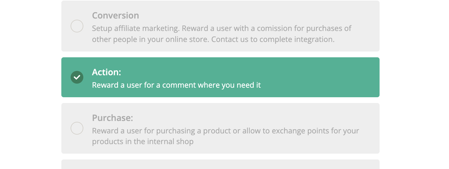 A simple wizard will help you set up the program and let you decide in which currency you want to reward users for completing which tasks. This can be regular currency or points. In addition, there is an internal rewards store where users can exchange them for anything you decide to encourage them to do: discounts, coupons, products, tickets and much more.