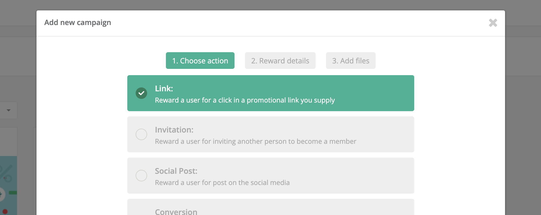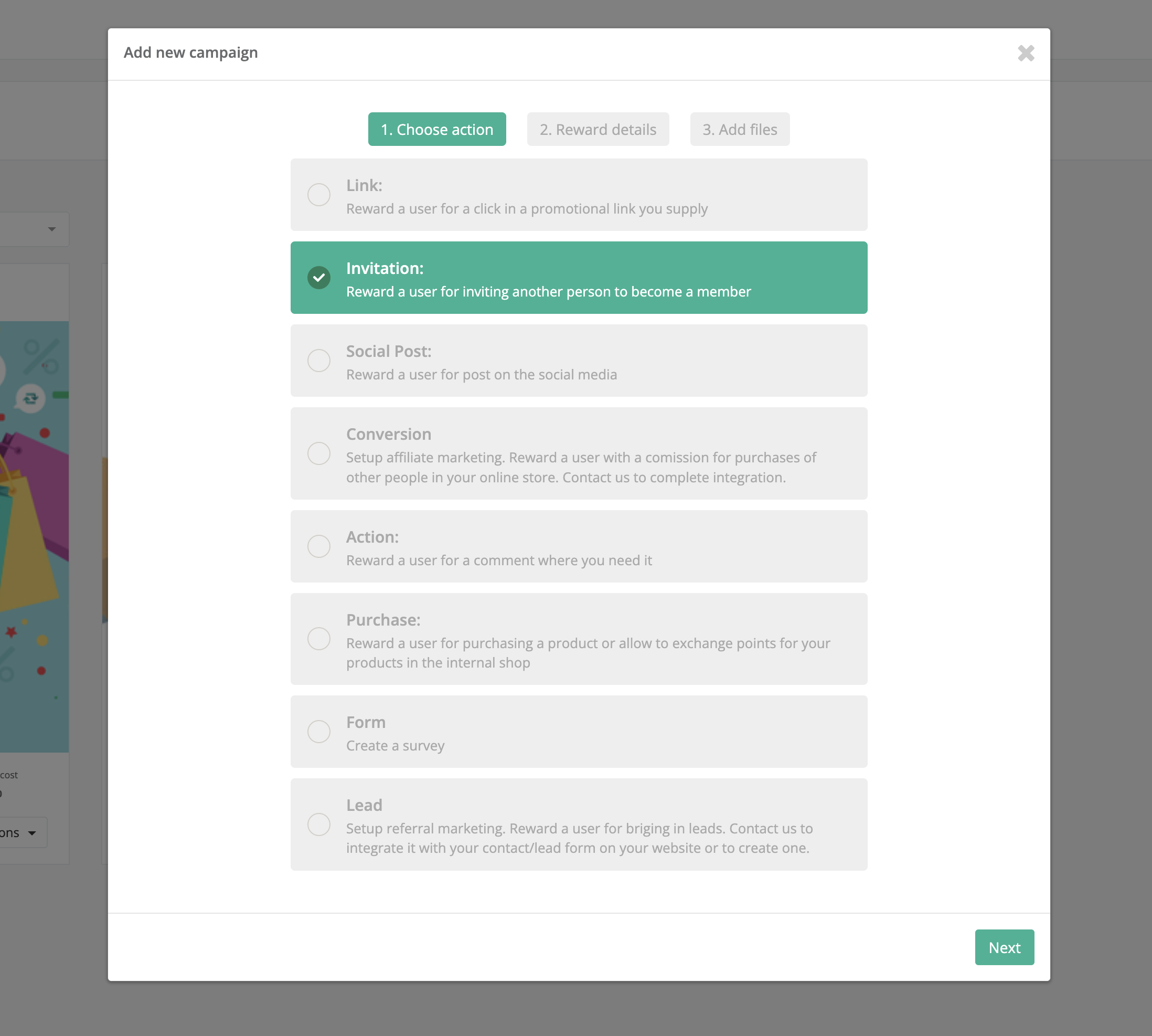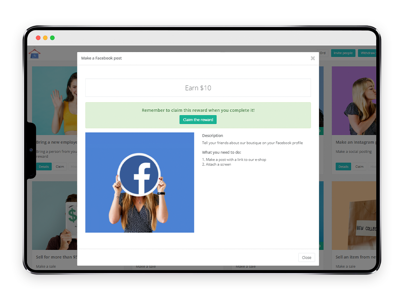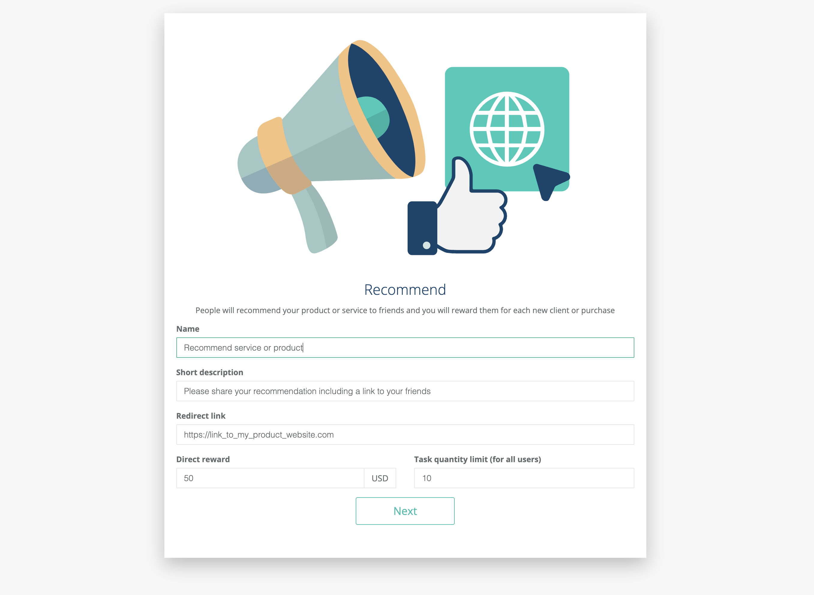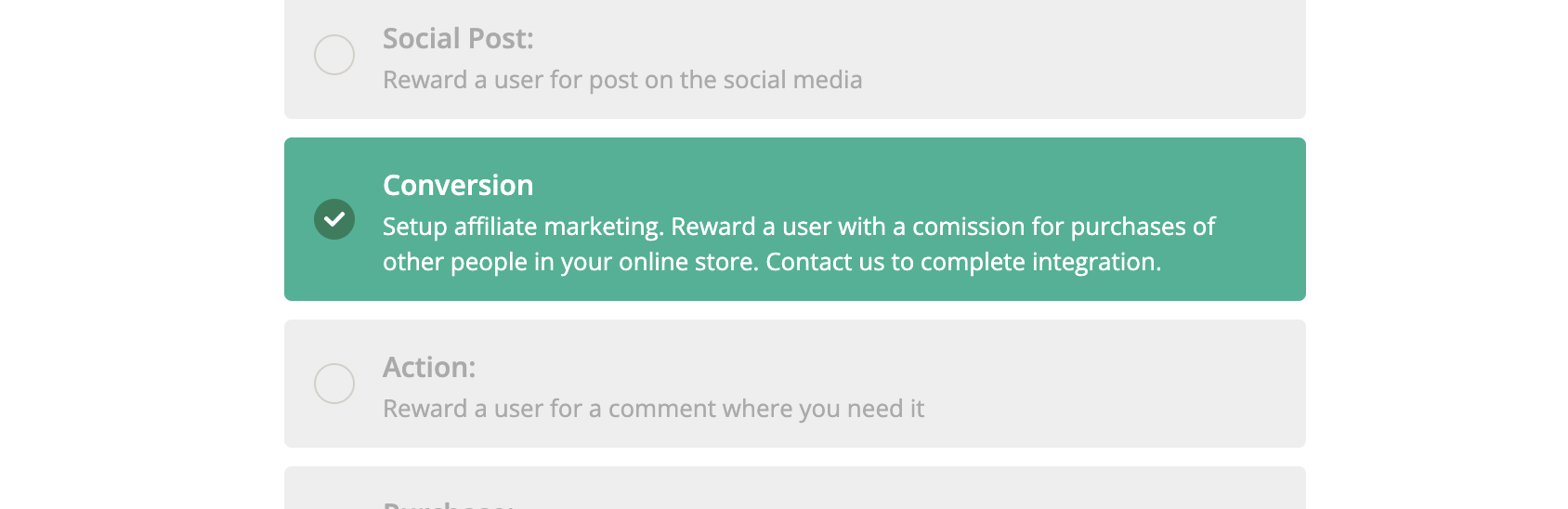 A simple wizard will help you set up the program and let you decide in which currency you want to reward users for completing which tasks. This can be regular currency or points. In addition, there is an internal rewards store where users can exchange them for anything you decide to encourage them to do: discounts, coupons, products, tickets and much more.