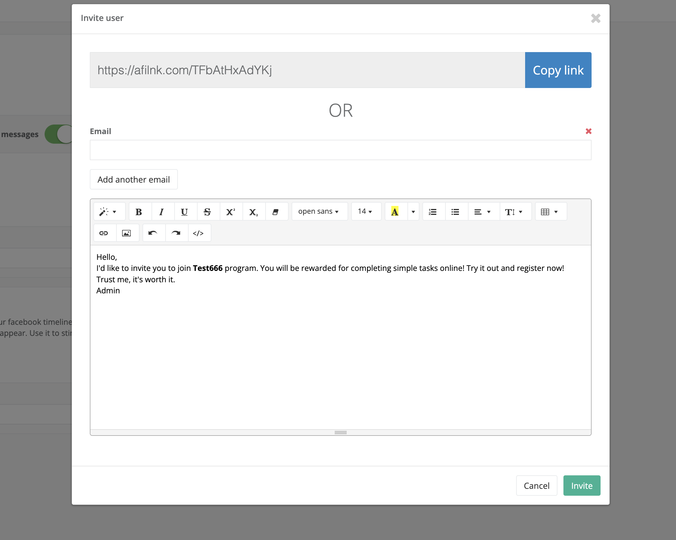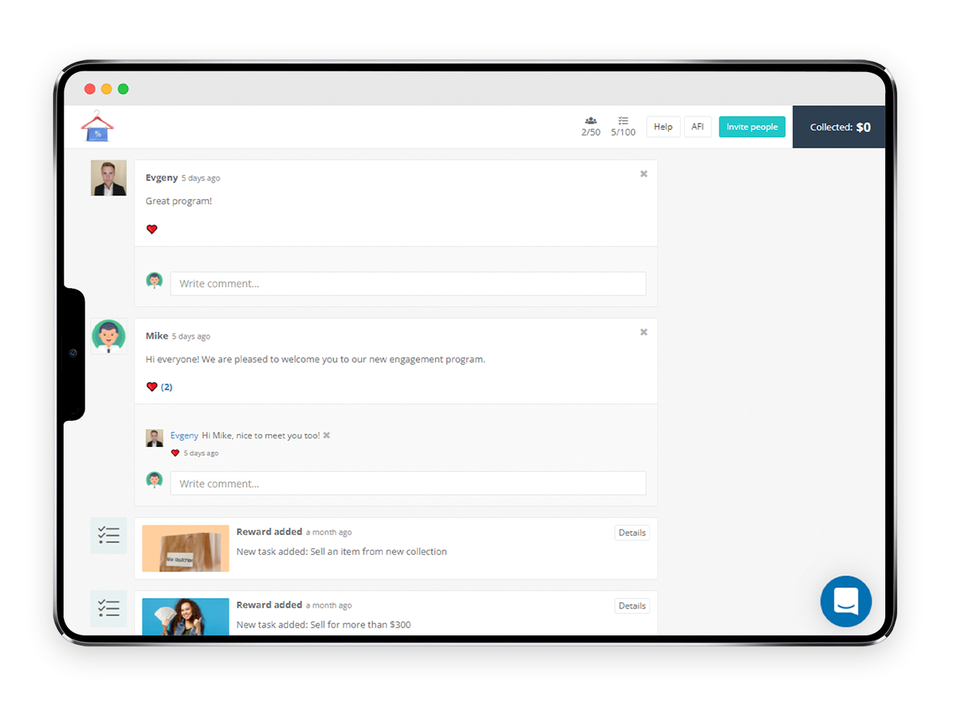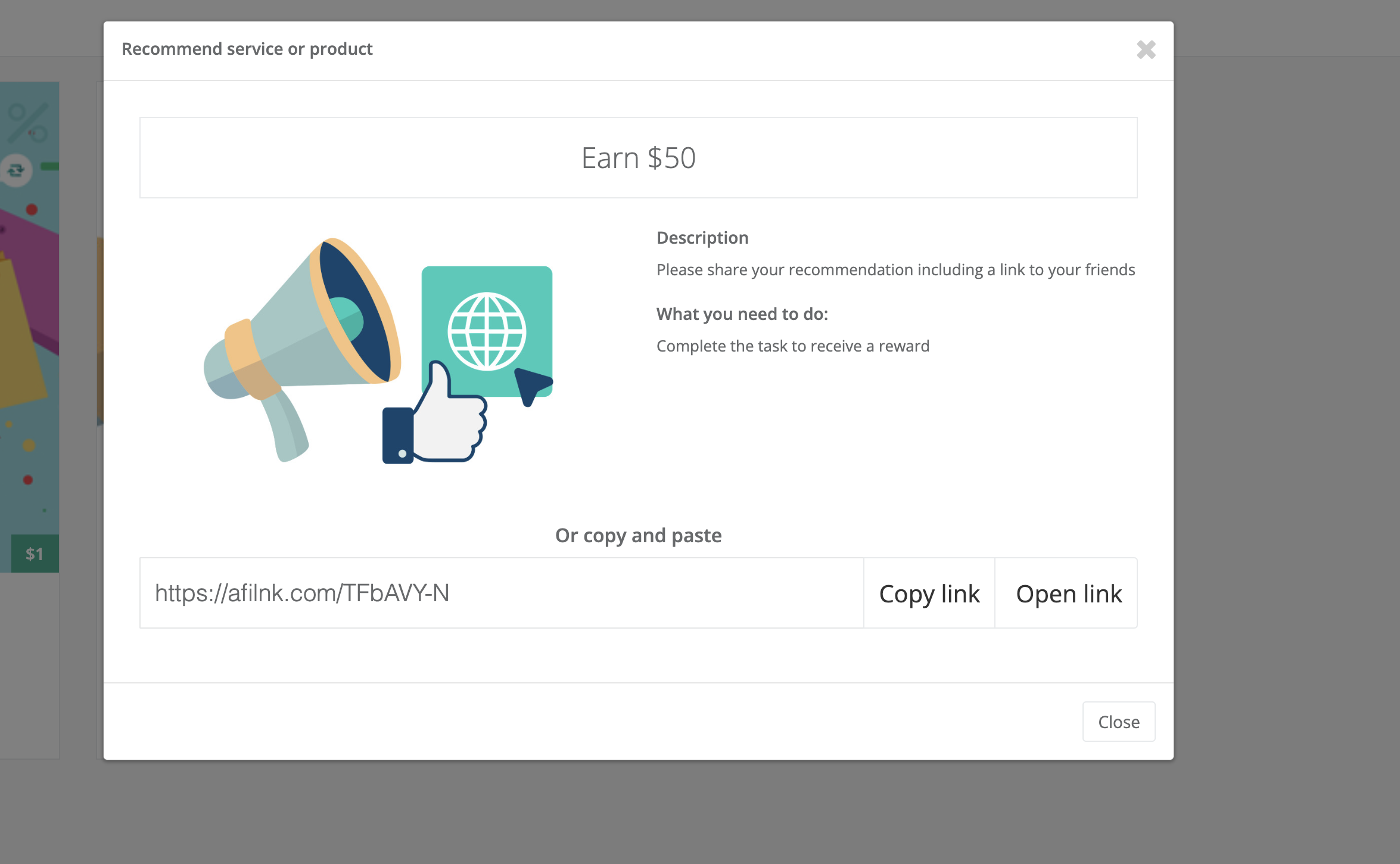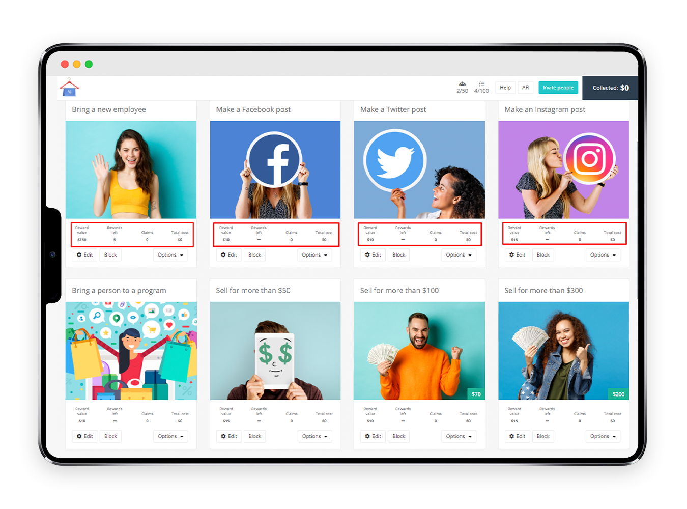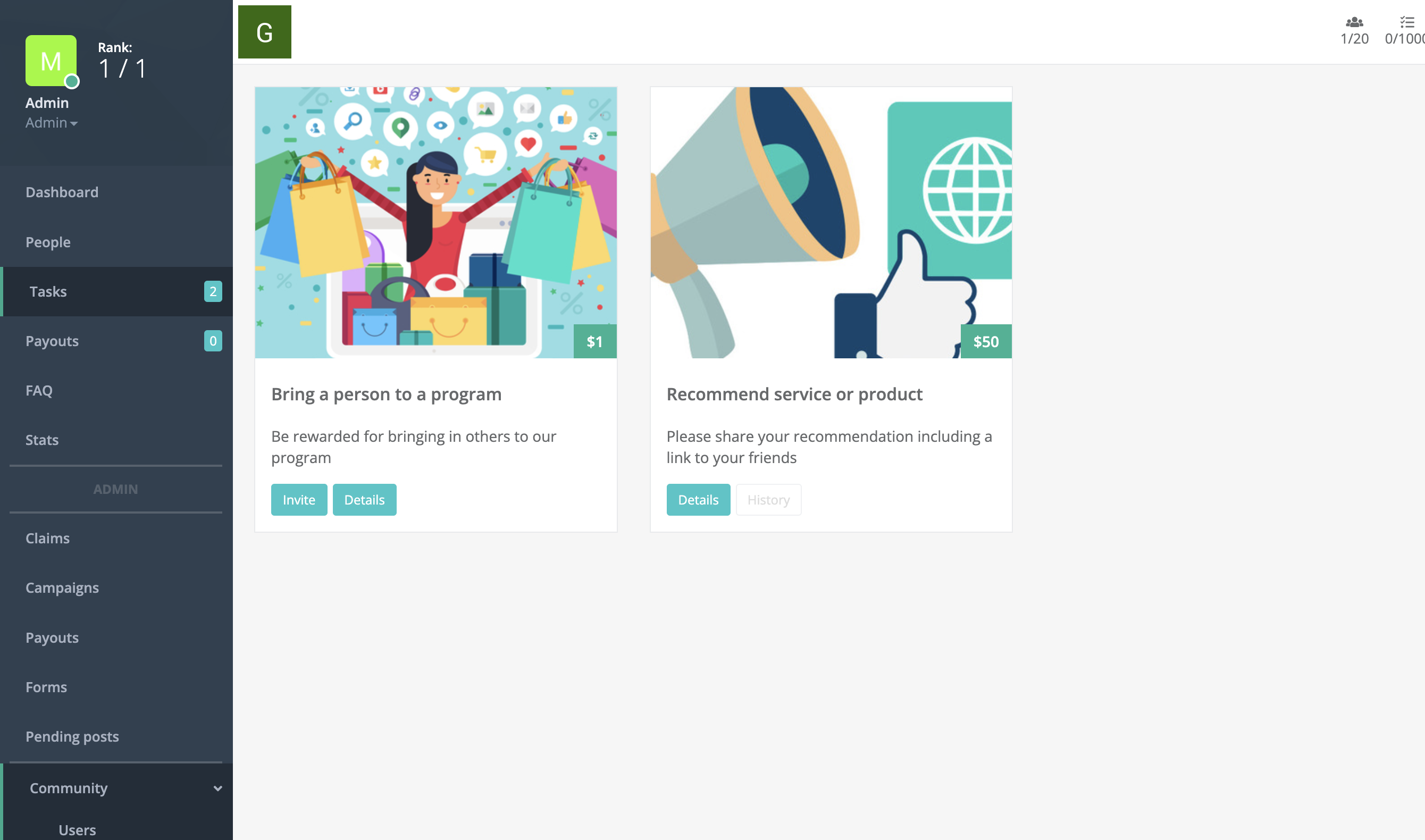 A simple wizard will help you set up the program and let you decide in which currency you want to reward users for completing which tasks. This can be regular currency or points. In addition, there is an internal rewards store where users can exchange them for anything you decide to encourage them to do: discounts, coupons, products, tickets and much more.
