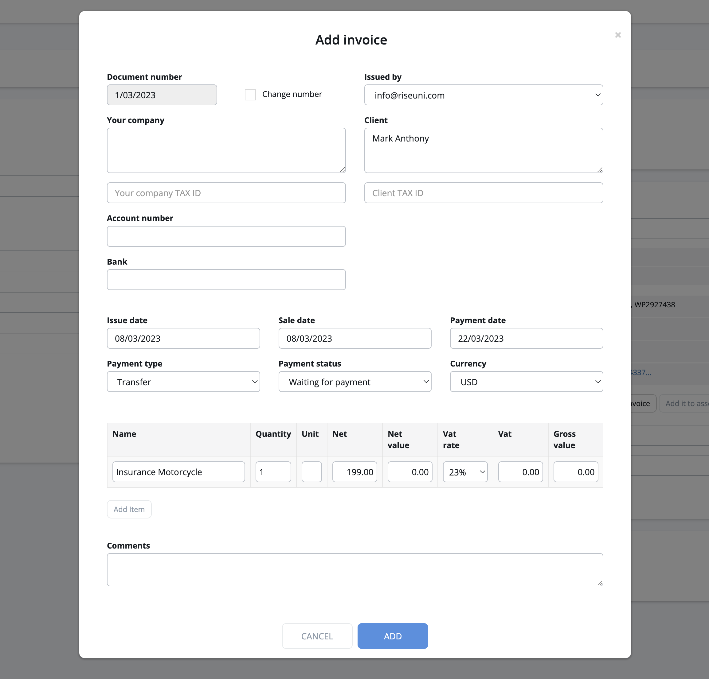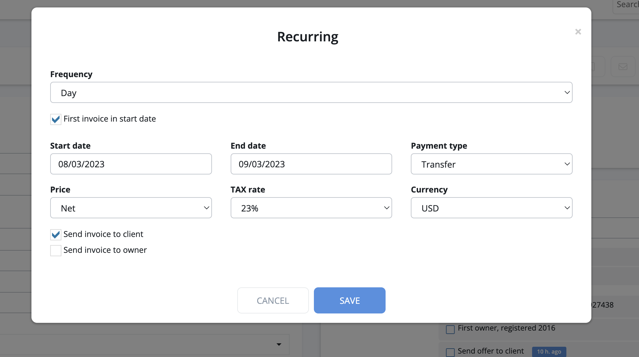 Yes, you can add a recursive record. What does it mean? The sales record will be generated periodically. It can be processed by your employees, but it can generate and send an invoice immediately