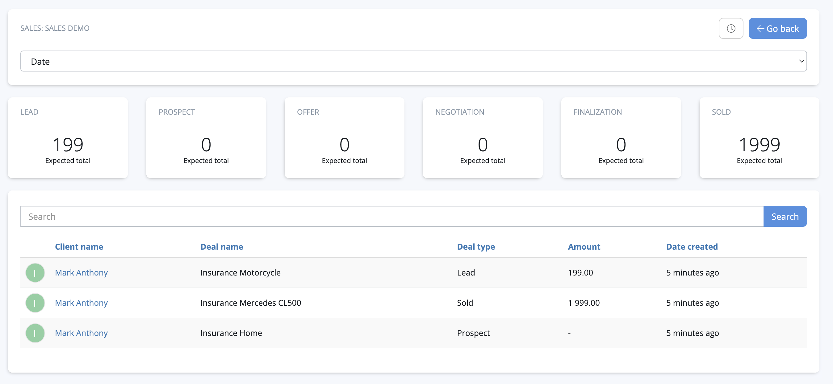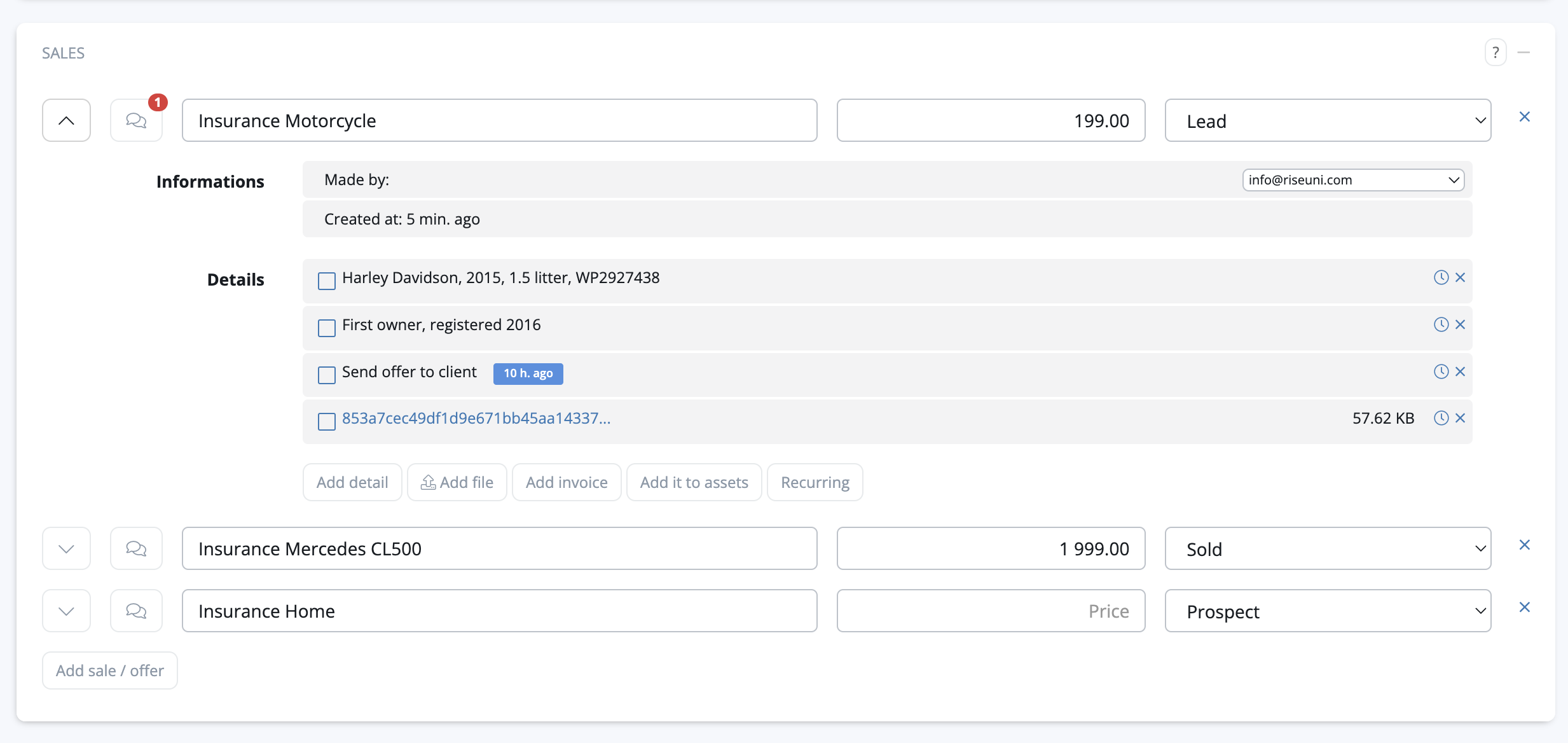 You start by specifying the type of sale, price and stage. This way you can build a simple sales funnel and follow it to see how many customers are on track to close a sale.